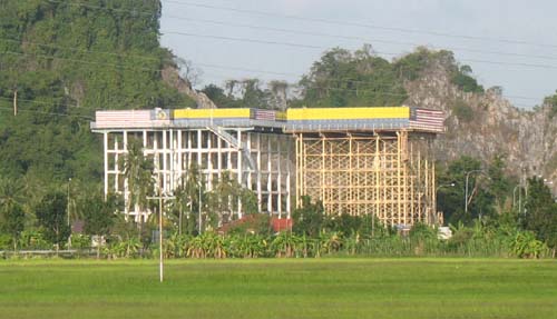 The following day I moved towards Kuala Perlis stage to the border of Thailand. The road through the rice plantations is without much interest, the landscape is resolutely flat with some karstic relieves. The ferry of Kuala Perlis takes only passengers; on the other hand that one of Kuala Kedah in the south of Alor Setar embarks cars and trucks. The bivouac is on a side-walk in the rice plantations at a hundred metres from the sea. |