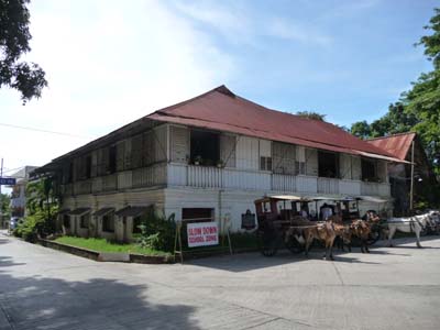 | L’architecture des maisons de Vigan est une synthèse du style mexicain et chinois avec des décorations philippines. Les fenêtres sont garnies non de vitres mais de coquilles de capiz-shell. Le rez-de-chaussée est en maçonnerie alors que le premier étage est en bois de tek. | |