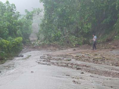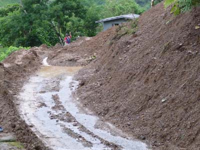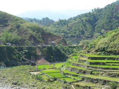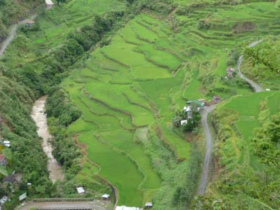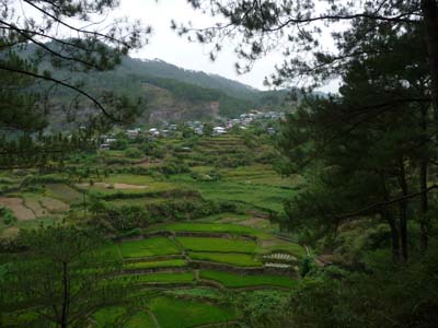 L’après midi je partis en excursion pour Hapao en tricycle sous la pluie pour voir les cultures de riz en terrasses. La route étant coupée par un glissement de terrain je continuais à pied ; comme je le dirais plus loin ce fut un mauvais présage, mais je ne le savais point. Le chauffeur du tricycle avait omis de m’en informer. Les cultures de riz en terrasses ne sont pas les plus spectaculaires, celles de Batad, inscrites au patrimoine mondiale, sont totalement dans les nuages et requièrent plus de neuf heures de marche aller et retour. Le 07/05 la pluie persistant je décidais de ne pas aller à Batad malgré les conseils malavisés du chauffeur du tricycle. |