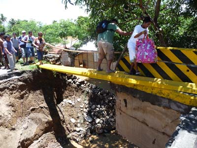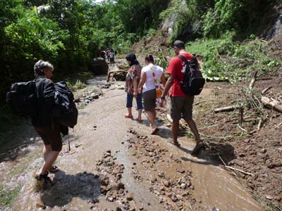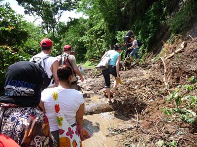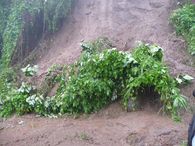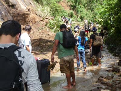 Je passais la journée à lire dans la salle commune de l’hôtel attendant le bus de nuit me ramenant à Manille. Il partit vers 20:00 sous la pluie, bientôt des glissements de terrain apparurent requérant la vigilance du chauffeur. Vers 21 heures un glissement de terrain se produisit devant le bus qui s’arrêta sans pouvoir le franchir. Le chauffeur parqua le bus pour assurer la sécurité des passagers, il le déplaça plusieurs fois des glissements de terrain se produisant latéralement. La nuit fut longue au bord de la route. Au petit matin nous allâmes en reconnaissance, il fallut se rendre à l’évidence, le bus ne pouvait continuer sa route. Des villageois nous apportèrent des boissons chaudes et rafraîchissantes. Vers 10:00 le chauffeur après des contacts téléphoniques nous informa que les engins de génie civil mettraient plusieurs jours pour ouvrir la route. Il nous conseilla de partir avec nos bagages pour trouver des jeepneys au-delà des glissements de terrain. Ce fut effectivement le cas après environ deux kilomètres de marche dans la boue et le franchissement de quatre à cinq glissements de terrain. Finalement nous prîmes un bus à la jonction de la route de Banaué et de Siantiago peu après Solano. Nous arrivâmes à Manille le 08/05 vers 19:30 soit près de 24 heures pour 340 kilomètres, mais heureux d’être sain et sauf. |