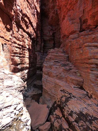 On November 30, I had decided to traverse two class-5 tracks with walking on water, I thus fitted trek sandals. The crossroads over Joffre Gorge, Hancock Gorges, Red Gorge and Weano Gorge was very impressive, alas pictures do not give the dramatic landscape. |