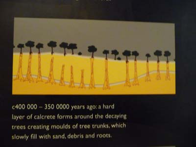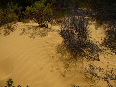I paid a visit of the park in the next morning while waiting for the dispersion of morning fogs and clouds darkening the sky. The light was not good enough. Curved by a strong wind from the sea I strolled the loop which twisted between pillars by on the move. The spectacle was dramatic evoking either ruins of a buried city or broken columns of a engulfed cemetery by any natural or human cataclysm. Colour and texture of sand are unusual, mixture of fine particles of golden grain and broken white mother-of-pearl. I could not satisfy me this strange scene of millionaire natural erosion. |
