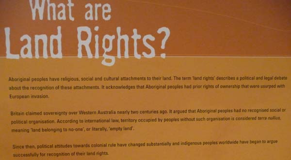 On Saturdays December 19, I left to discovered the old Perth to knowing buildings dating back from the end of the 19th century primarily civil and religious. I started with the Western Australian Museum whose only interest is the showroom dedicated to the indigenous people and their conflicts with the British settlers and finally the recognition of their rights on the land of their ancestors. In the Australian literature they are called the "Traditional Owners". The text presented here is a piece of bravery, the abolition of the concept Terra Nullius. The room is rich in documents of this time, pictures and official files. |