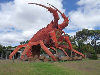 In the early morning of March 10, I have a serenade of a bird at my door. The day was announced under happy auspices. But the remainder of the day was without attraction. The road skirted the coastal band of Coorong NP. After having lunch I reached Kingston SE where I was accommodated by the Giant Lobster. It is a curiosity without being a masterwork, it is lacking some much. But Australians are fond of these concrete structures. I was going to throw an eye at Cape Jaffa where a marina was under construction. I bivouacked shortly after. This day was without rain although the barometer is always very low. |