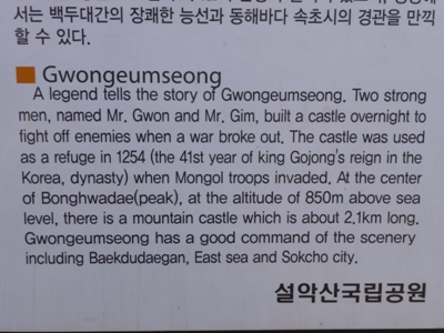 In this sunny and windy Sunday many Korean families spread themselves merrily on the footpaths of Seoraksan National Park listed on the World Heritage I walked during five hours going from sight to sight. I returned to the hotel tired but purified from miasmas of Seoul. |