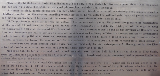 On Monday December 6 I left Seoraksan NP to return to Sokcho to take an intercity bus to go to Gangneung where I had two sites to visit. Ojukheon, a sacred site where the mother, Shin Saimdang, and her son, Yulgok Yi Yi, the teacher of the nation were born. The site is composed of several buildings distributed in courtyards according to a Chinese plan, they were built about 1450 and are remarkably well preserved. Yulgok Yi Yi has his effigy on the note of 5000 KRW and Sin Saimdang on that of 50,000 KRW put soon in circulation. |