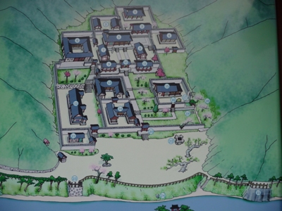 During my visit a group of teenagers took part in a ceremony of presentation to the temple, I tried to make it explained alas without success. A small museum recalls the life, the activity and the writings of Yi Hwang. Breaks embellished this cold day, -3°C, in mountain of medium altitude. On the road leading to Dosa Seowon vehicles were copiously sprinkled by automatic rotary jets of disinfecting for a reason which I am unaware of. The area cultivates fruit trees. |