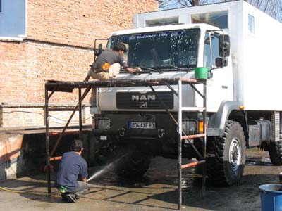 laver le camion encore chargé de la boue du Tibet et couvert de deux mois de