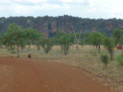 Le lundi 09/11 je passais une grande partie de la matinée au Telecentre de Kununurra pour publier les pages de mon site, répondre aux courriels et envoyer des messages pour continuer d’instruire les trois problèmes à résoudre d’ici la fin de l’année. Ensuite je me dirigeais vers la Gibb River Road dont la réputation est désastreuse, très dégradée. De plus le Visitor Centre me confirma de nouveau que de nombreux parcs étaient fermée, la saison touristique était terminée et la saison des pluies avait commencé. Je persistais à m’y engager. Elle était effectivement dégradée avec de la tôle ondulée très cassante. Les paysages étaient grandioses malgré un ciel couvert et une brume stagnante. |