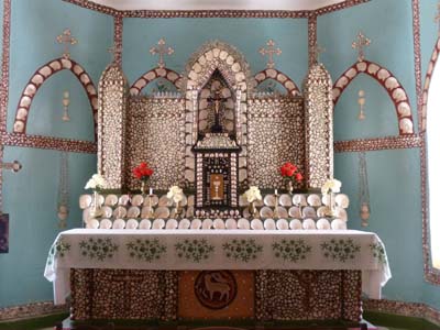 Le 17/11 j’avais décidé de me reposer à Middle Lagoon. En route je me détournais de cinq kilomètres pour voir la célèbre église du Sacré-Cœur à Beagle Bay dont l’autel est couvert de coquillages de perle. L’ensemble était surprenant ni vraiment beau ni vraiment laid, synthèse de l'art aborigène et de l'art baroque allemand. Ce fut l’œuvre d’une congrégation allemande, emprisonnée en 1915 pendant la Première Guerre Mondiale, avec l’aide des aborigènes locaux convertis au christianisme. |