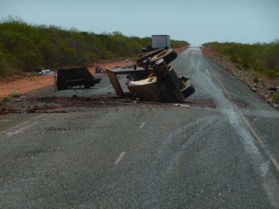 C’était un road train de messagerie avec deux remorques dont la deuxième portait une voiture et un engin de chantier. Il m’avait doublé avant le Sandfire. En doublant un autre road train et en se rabattant trop brusquement la deuxième remorque oscilla et perdit l’engin de chantier ; puis en freinant brutalement la voiture sur la remorque fut projetée vers l’avant entre les deux remorques (photo dans la galerie). Conclusion l’engin de chantier et la voiture étaient mal arrimés. Les road trains roulent à la vitesse autorisée, ici 130 km/h. Le poids maximum avec quatre remorques peut atteindre 250 tonnes ! |