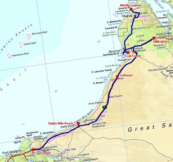 Ce fut une semaine de route avec deux étapes de repos à Middle Lagoon et à Eighty Mile Beach. |