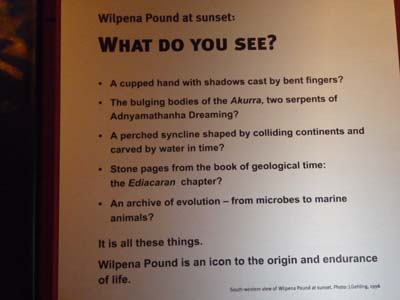 Mais le point d’orgue fut la galerie des minéraux avec la découverte dans les Flinders Ranges des plus anciens fossiles du monde datant de l’ère Ediacaran. Une photo de Wilpena Pound est très expressive. |