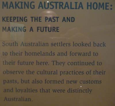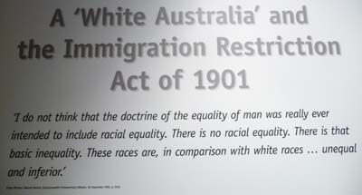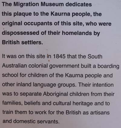 Puis je m’arrêtais longuement au Migration Museum, je me demandais s’il s’agissait d’un acte de contrition, officiel ou circonstanciel. Là aussi je donne des exemples qu’il n’est pas utile de traduire. Les contacts que j’ai eus montre à l’évidence qu’il y a loin de la coupe aux lèvres, les australiens de souche anglo-saxonne restent très anglais. |