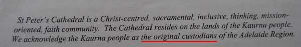 Vers 10.30 j’entrais dans la Cathédrale St Pierre au début de l’office religieux du rite anglican. Je reçus une brochure des lectures et des psaumes afférents à l’office. J’eus la stupéfaction de découvrir en bas de page le commentaire dont la photo figure ci-dessous. Force est de constater que l’Église Anglicane, rattachée à la couronne d’Angleterre, emploie les mots de "Orginal Custodians" au lieu de l’officiel "Traditional Owners". La nuance n’est pas de pure forme, l’Église reste attachée au concept de Terra Nullius qui considère que la terre appartient à la couronne d’Angleterre. |
