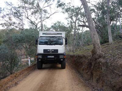 Le lendemain je quittais le bivouac pour franchir le pont limité à 20tonnes, pas de crainte le camion est bien en deçà. Toutefois les planches me rappelèrent certains ponts en Mongolie. Puis ce fut la descente vers Orbost, la route était une gravel road parfois asphaltée dans une vallée très étroite. |