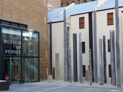 I took again the train for the centre and I visited the Museum of Sydney built on the site of the colonial governor's house dating back to 1788 and destroyed in 1846. The exhibits recall the Sydney's evolution and its relations with Aboriginals. In front of the building totems symbolize the skirt of forest from where Cadigal people observed the 1500 settlers unloading from the First Fleet in 1788 to found a penal settlement. |