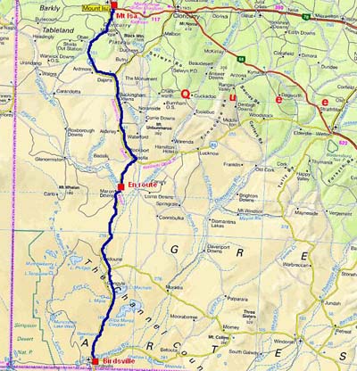La route de Bedourie à Birdsville est appelée "The Bilby Way", nom du rabbit-eared bandicoot. Elle est parsemée de points d’eau tant pour le bétail que pour les chameaux qui transportaient les denrées et le matériel de construction. Deux autres curiosités sont au bord de la piste. |