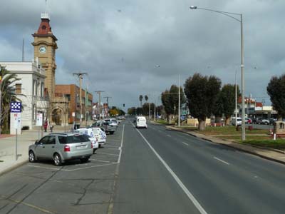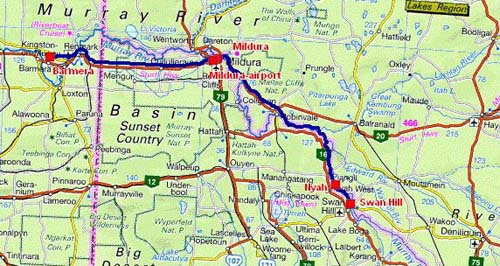 Le jeudi 26 août je quittais Barmera sans nostalgie tant le temps fut exécrable. En route pour Mildura la météorologie ne s’améliora pas. Avant d’arriver la campagne se couvrit de vignobles en habit d’hiver. Je m’arrêtais à l’entrée de la ville sur une aire de repos. |