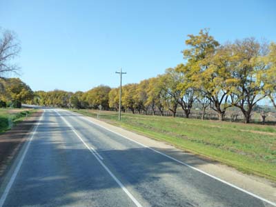 Non, la Murray Valley Hwy ne longe pas la rivière mais serpente entre les vergers de cerisiers en fleurs, d’arbres d’agrumes chargés de fruits et de vigne sans feuille. Certes le paysage est de grande beauté mais pendant 200km c’est monotone. Je m’arrêtais au bord de la rivière à Nyah derrière l’hippodrome. |