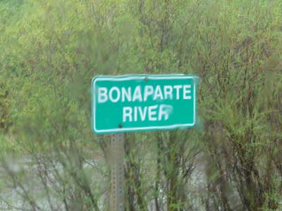 La journée se passa entièrement sous la pluie ; les lourds camions circulaient à la vitesse autorisée 100km/h me doublant en trainant un rideau de pluie aveuglante. Malgré les magnifiques paysages le long de la Fraser River puis du Fraser Plateau ce ne fut pas un réel plaisir de voyager. En route peu avant Hat Creek Ranch je découvris une petite rivière appelée Bonaparte, étrange pour un pays jadis administré par les britanniques ! |