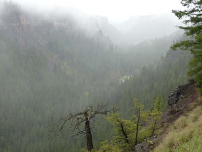 Plus loin je déjeunais sur le parking du Chasm Park dont le paysage était noyé dans la brume et copieusement arrosé par la pluie. Tout au long de la route les road houses subsistants étaient autant de milestones, 47 Mile House, 70 Mile House, 100 Mile house pour les principaux. Je tentais de trouver un bivouac au bord du Lac La Hache hélas occupé par des résidences, je me contentais d’une aire de repos bien humide. |