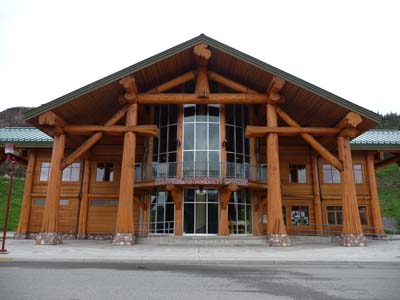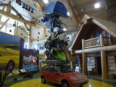 Journée sans pluie mais sans beaucoup d’attraits, à Williams Lake le somptueux Visitor Centre en troncs d’arbres –logs– hormis la moisson de brochures ne présentait pas beaucoup d’intérêt sinon la sculpture centrale d’un enchevêtrement d’articles de sport utilisés dans la région. |