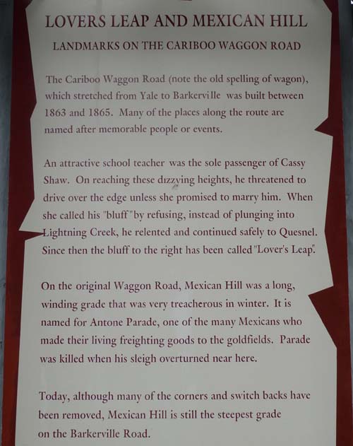 La Cariboo Wagon Trail fut construite par les ingénieurs de l’armée britannique dans les années 1860 à partir de Lillooet, 0 Mile Stone, parcourant 400 miles soit environ 644 kilomètres. Un road house était édifié tous les 12 ou 14 miles. Dans les années 1800 elle était considérée comme la huitième merveille du monde. |