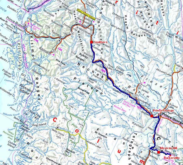 Le lendemain fut encore une journée ensoleillée dans des paysages de grande beauté, des montagnes couvertes de conifères, de vertes prairies semées de fleurs printanières et des lacs aux eaux sombres. L'altitude est d'environ 700 mètres. Mais la population n’est jamais très loin. Malgré le nord de la Colombie Britannique il est impossible d’être seul comme en Australie. En ce dernier dimanche de mai les Visitors Centres et les musées le long de la Hwy 16 étaient fermés, pas de quoi se rincer l’œil sauf à Vanderhoof dans la Banque du Canada et une maison en rondins. Je bivouaquais à Smithers en route vers Prince Rupert. Les distances entre les bivouacs s'allongeaient. |