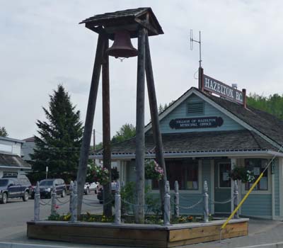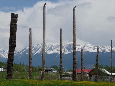 Le lundi 30 mai le soleil joua à cache-cache derrière les nuages puis un orage éclata vers 16 heures. En fin de matinée je visitais à Hazelton deux villages historiques des Premières Nations, Ksan Village puis Kispiox Village. Ksan Village –Gitxsan people– se compose de sept Longhouses précédées de Totem Poles dont quatre sont visitées avec un guide, hélas no picture. Le musée expose quelques objets traditionnels mais les trois autres sont beaucoup plus intéressantes avec une animation audio présentant les objets dans leurs vocations culturelles insérés dans le mode de vie. Les maisons, les objets et les totem poles sont faits avec du red cedar –thuya géant rouge– |