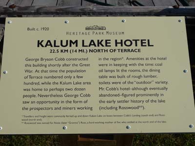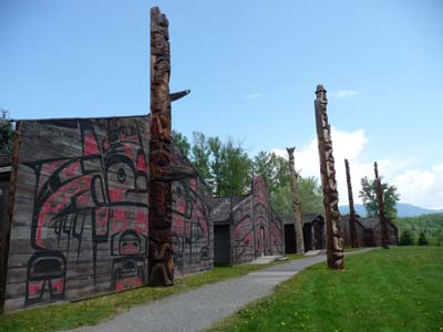 Le dernier jour de mai fut une journée de grand soleil avec une légère brume descendue des sommets enneigés. Le premier arrêt fut à Terrace pour visiter l’Heritage Park Museum. La ville fut construite à la fin du 19e siècle et prit son essor avec l’achèvement de la voie ferrée jusqu’à Port Rupert puis dans les années 20 par la construction d’un pont métallique enjambant la Skeena River. Les années 30 et la grande Dépression entraîna son déclin à 500 habitants. La Deuxième Guerre Mondiale par le maraudage des navires de guerre japonais relança l’activité économique avec l’arrivée des armées du Commonwealth. Aujourd’hui la ville est un important carrefour économique par l’exploitation forestière et l’immense complexe de fonderie d’aluminium à Kitimat. Le Park regroupe huit maisons en rondins de thuya géant rouge construites au début du 20e siècle. |