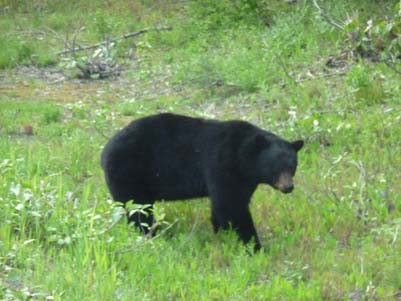 Au réveil j’avais décidé de tenter ma chance en poursuivant ma route sur la Hwy#16 malgré les panneaux Road Closed. Mais avant d’atteindre la jonction des Hwys #16A et #16 je pris deux photos, d’abord le glacier et sa couleur bleue translucide puis un ours broutant l’herbe du talus et me regardant sans crainte, comme un bovin. |