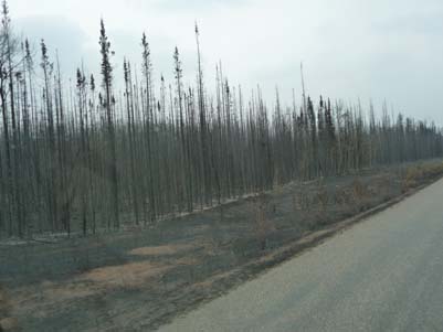 En route je m’informais aux relais rencontrés, j’obtins toujours la même réponse : la route est fermée, mais à Dease Lake vous aurez des informations. Las, je m’obstinais en continuant. A Dease Lake j’appris que la route était ouverte en convoi avec un pilote à 160 km au nord de la ville où j’arrivais à 16:00. Un convoi partit à 17:00 pour atteindre une heure plus tard la jonction avec la Hwy#97. Conclusion, le pire n’est jamais certain, mais parfois c’est un coup de poker. Ce fut une longue journée par un temps froid, brumeux et pluvieux. Les arbres de la forêt en bordure de la route étaient calciné sur tout le trajet et des fumeroles s’échappaient encore du sol et des troncs pendant qu’un hélicoptère tournoyait en observation. J'étais perplexe quant à la cause de l'incendie... |