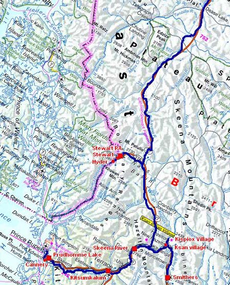 De bon matin j’équilibrais la pression des pneus qui avaient été permutés puis je fis le plein des réservoirs de gazole et du réfrigérateur en prévision de la longue route vers le nord. Je quittais Terrace vers 8:00. A Kitwanga je pris la Hwy#37 appelé Stewart-Cassiar Highway pour Watson Lake, elle évite de faire un long détour pour prendre l’Alaska Highway, Hwy#97. Hélas, en route je découvris un panneau annonçant que la Hwy#37 était fermé mais que la Hwy#37A était ouverte. J’allais donc à Stewart et à Hyder, la ville jumelle en Alaska. Le seul intérêt de ces deux villes est de voir des glaciers ainsi qu’en saison la remontée des saumons. Le passage en Alaska ne pose pas de problème il n’y a pas de douane, mais au retour il y a la douane du Canada qui vérifie symboliquement le passeport. Je discutais avec la douanière sur la cause de la fermeture de la Hwy#37. Un incendie de forêt dégageait un nuage de fumée obscurcissant l’atmosphère. Je pouvais aller jusqu’à Dease Lake puis décider de la poursuite vers le nord… |