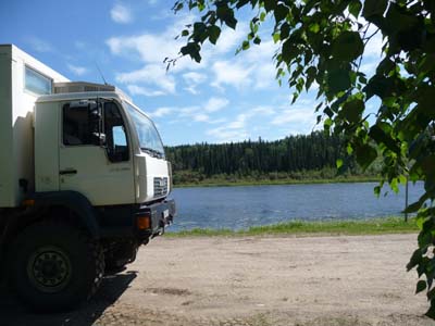 Le projet de voyage au Canada prévoyait d’aller dans les Northwest Territories visiter la capitale Yellowknife à partir de l’Alberta par la Hwy #1. Un Québécois rencontré au Triple "G" de Fort Nelson me conseilla la Liard Trail, route de gravier, qui est plus directe. Le temps était au beau, je décidais de suivre son conseil. En effet jusqu’à Fort Liard la route de gravier était en bon état. Le village compte environ 600 habitants de la communauté d’Acho Dene ayant campé dans le site depuis plus de 9.000 ans. Actuellement l’activité économique est centrée sur l’artisanat. Il est considéré comme "Les Tropiques du Nord" par son climat le plus chaud des NWT. Pour midi je stationnais au bord des Hay Lakes puis je décidais d’y rester pour la nuit. La température était élevée pour cette latitude, +20°C. |
