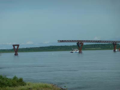 Enfin quelque part entre deux maisons actuelles une vieille grange pourrissait lentement. Je terminais la journée en retournant au bord de la rivière pour bivouaquer. Eu égard à l'absence de richesse en bâtiment historique et en musée de la région je renonçais à aller à Wrigley, 440 km retour de route de gravier. Je ne peux pas ne pas mentionner que l'intérêt de Fort Simpson réside dans les voyagistes qui organisent des circuits dans le Nahanni National Park accessible uniquement par hydravion au coût exorbitant en solo. |