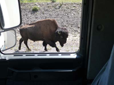 La Hwy #3 longe le Mackenzie Bison Sanctuary, il n’est pas rare de voir des bisons des bois broutés l’herbe du bas-côté ou vautrés dans leur bauge. |