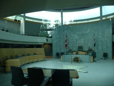 A côté l’Assemblé législative fut inaugurée en 1993 pour les cessions des 19 députés des Territoires. Comme dans les anciennes colonies de la Couronne d’Angleterre la Masse est un symbole important du rite législatif. |