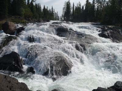 Le samedi 30 juillet j’entrepris une excursion le long de l’Ingraham Trail qui serpente dans un paysage Précambrien avec de nombreux lacs et chutes d’eau. Je fis de courtes promenades pour les visiter, je pique-niquais au Cameron River Crossing Day Use area. Ce fut une journée de repos sous un ciel légèrement voilé. J’établis mon bivouac au bord d’un lac en espérant ne pas être en infraction ! |