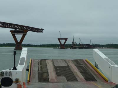 La journée du 1er août commença dans la pluie et le brouillard, ce dernier disparut dans la matinée mais la pluie persista par intermittence toute la journée et bien sûr pendant la visite des chutes d’eau ! En route j'embarquais de nouveau sur le ferry pour traverser le Mackenzie River. |