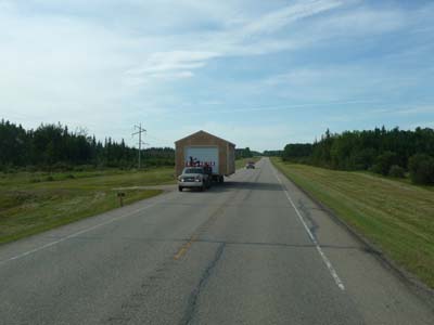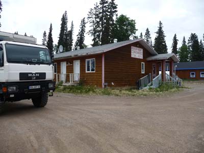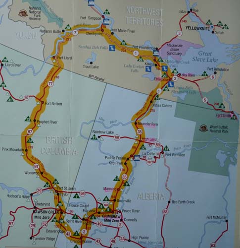 Ce fut une longue journée de route pour retourner à Hay River par les Hwy #5 & #2 puis par la Waterfalls Route Hwy #1 jusqu’à la frontière du NWT avec AL –Alberta– sur le 60e parallèle. Ces Hwys traversent une plaine couverte d’une forêt boréale dense composée de black spruce, de bouleau et de taillis. Par endroit l’eau affleurait la surface du sol et pourtant il y a des incendies de forêt. Je m’arrêtais pour jeter un oeil au Mackenzie Crossroads Museum de High Level, rien de remarquable. Je trouvais un terrain vague hors de la ville pour le bivouac. Cette journée fut particulièrement chaude, 25°C. |