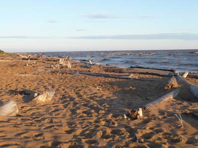 Au petit matin la lumière rasante du soleil levant éclaira joliment la plage du Great Slave Lake où j’avais bivouaqué. |