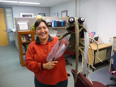 Au Visitor Centre de Fort Smith je fus accueilli avec humour par la charmante hôtesse qui voyant les piqûres de moustique sur mes avant-bras manipula une immense marionnette de moustique. Dans la salle d’exposition je découvris une photo de renards roux confirmant mon identification de la veille. Il y a un accès WiFi gratuit. Je visitais le village à pied. |