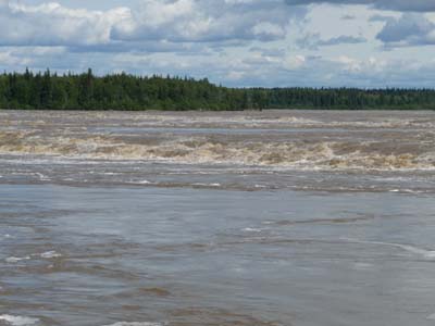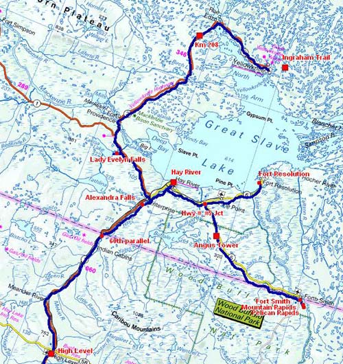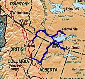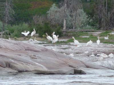 L’une des attractions majeures réside dans une colonie de pélicans sur les berges du Mountain Rapids. En effet entre Fort Fitzgerald, dans l’Alberta, et Fort Smith il y a quatre rapides sur la rivière des esclaves impossible à franchir par les bateaux. Depuis les temps anciens une piste de 24 kilomètres longe la rivière pour le portage des marchandises. J'en visitais deux. En fin de journée je retournais au Visitor Centre pour Internet. Je quittais Fort Smith vers 19 heures retournant à mon bivouac de l’Angus Tower. |