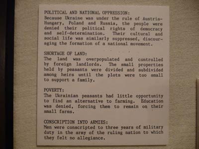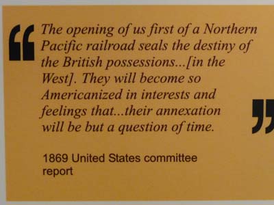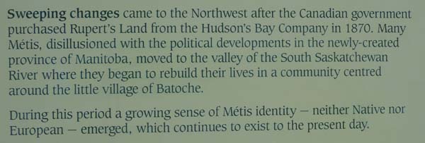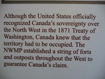 La première journée au Saskatchewan fut consacrée à deux visites avec un bond en arrière de plusieurs millions d’année. D’abord je visitais Fort Walsh dans le Cypress Hills Interprovincial Park. Bien sûr l’intérêt n’était pas le Fort mais l’Interpretive Centre qui dans une mise en scène très didactique donne d’amples informations sur son origine. Sa construction fut motivée par trois objectifs : Faire respecter la loi (en arrêtant le commerce illégale du whiskey avec les indiens), implémenter la politique Indienne du Canada (en encourageant les Premières Nations à s’installer dans les réserves), et en établissant la souveraineté du Canada sur les Territoires du Nord Ouest. Certains panneaux sont très éloquents. |
