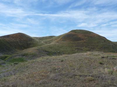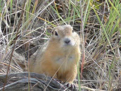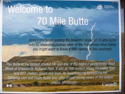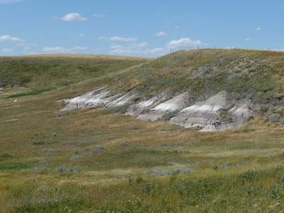 Le mardi 23 août fut encore une belle journée mais avec quelques nuages voilant le soleil. A Val Marie, porte d’entrée du Grasslands National Park, je m’enquérais des promenades à faire dans ce parc sans arbre. Sur les conseils du ranger je fis la boucle de 5 Km du "70 Mile Butte". Ce sont des montagnes érodées couvertes de graminées, chemin faisant je rencontrais, je pense, une marmotte qui me regardait avec circonspection. |