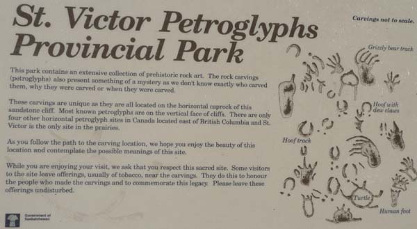 Un détour de 18 km me mena dans l’après-midi à St Victor où le Provincial Park protège des pétroglyphes dont l’objectif est inconnu et la date possiblement antérieure à 1750. Elles sont très abîmées par les intempéries. Je bivouaquais sur place. |