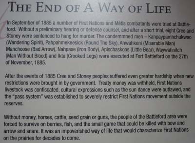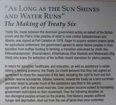 Le Saskatchewan a crée dans ses quatre principales villes, Moose Jaw, North Battleford, Saskatoon et Yorkton des musées thématiques, Saskatchewan Western Development Museum, autour de la colonisation de la province par les européens, WASP ; je ne les visitais pas préférant me concentrer sur l’installation des forts de la Gendarmerie Royale –the Mounties– pour assujettir les Premières Nations et les Métis. Cette histoire commença à Fort Battleford. Comme à Fort Walsh l’Interpretive Centre, installé dans un bâtiment du Fort, retint mon attention. Je présente quelques panneaux significatifs. Là comme en Australie, Tasmanie et Nouvelle Zélande, l’historien canadien a fait le travail de décantation pour citer les faits. La duplicité du gouvernement du Dominion Canadien apparaît dans toute son horreur. Après avoir abattu tous les bisons pour fournir le commerce des fourrures, les Premières Nations, sans subsistance, étaient contraintes de signer des traités léonins qui ne furent jamais honorés. Affamées elles se révoltèrent et furent abattues comme des bisons ; les survivants furent parqués dans des réserves incultes et les chefs pendus haut et court. Certes je résume un peu court, mais enfin la réalité est intangible et les faits sont têtus. |