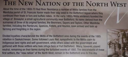 L’objectif de la journée fut de visiter Batoche, lieu historique du Canada, où se déroula une bataille entre les métis et l’armée britannique, une page peu glorieuse de la colonisation britannique, bien que le général Middleton commandant de la force expéditionnaire fut récompensé et devint le gardien des joyaux de la couronne ! Comme avec les Premières Nations le gouvernement d’Ottawa ne respecta jamais avec les métis ni les traités signés ni la parole donnée. Il ne reste que l’église et le presbytère et bien sûr le cimetière où reposent les protagonistes de cette bataille qui opposa 800 soldats puissamment armés à 200 métis équipés de fusils. Un mur d’images avec trois projecteurs met en scène les causes du conflit et la bataille à partir de photos d’époque et d’une reconstitution. Je trouvais un excellent bivouac sur la rive de la Saskatchewan Sud. |