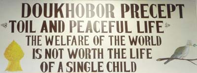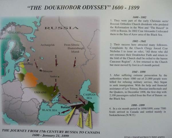 Au bivouac je m’aperçus que le village de Veregin recélait des informations intéressantes concernant une communauté russe. Je fis donc un long détour pour aller voir ce village crée par les Doukhobours persécutés par le régime Tsariste. Avec l’aide de Tolstoï qui leur donna les droits d’auteur de son roman Résurrection ainsi que de la Société des Amis, Les Quakers, 7.500 Doukhobours immigrèrent au Canada en 1899. |